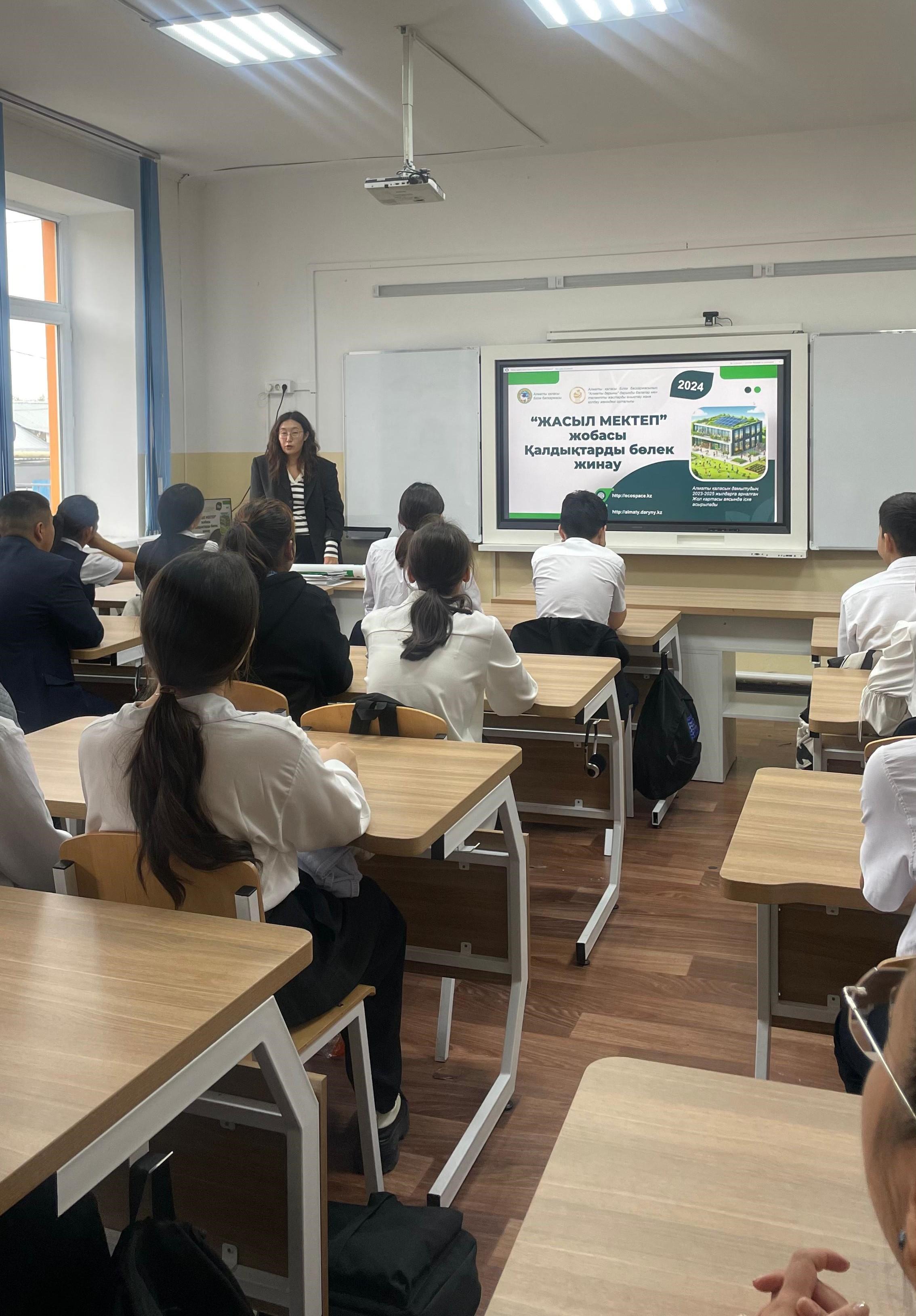 26 сентябрь 2024 0 1 2 3 4 5 "Жасыл мектеп" жобасы аясында экобелсенді оқушыларға лекцияға қатысты. Қоқыстарды сұрыптау мақсатында экобокстар қойылды