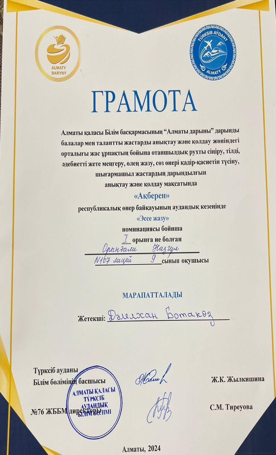 09 октябрь 2024 0 1 2 3 4 5 "Ақберен" республикалық өнер байқауының аудандық кезеңінде 9"Б" сынып Орынғали Назгүл І орынға ие болды.