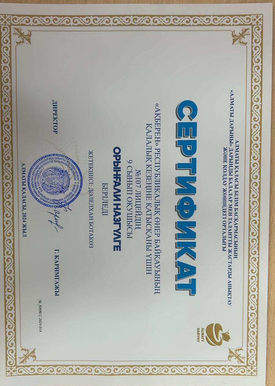 15 октябрь 2024 0 1 2 3 4 5 "Ақберен" Республикалық өнер байқауының қалалық кезеңінен 9Б сынып оқушысы Орынғали Назгүл ІІ орынға ие болды.