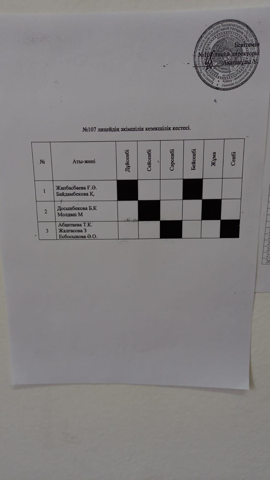 107 лицей бойынша Наурыз мерекесі қарсаңыздағы кезекшілік кестесі