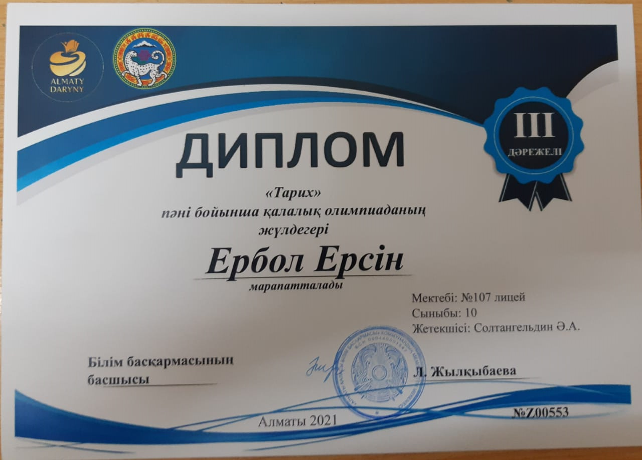 14 апрель 2021 0 1 2 3 4 5 "Тарих" пәні бойынша қалалық олимпиаданың жүлдегерлер лицейіміздің 10"Б" сынып оқушысы Ербол Ерсін 3 орынмен марапатталды. Пән мұғалімі: Солтангелдин Әділет. Құтты болсын!